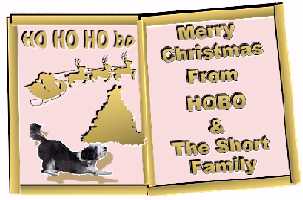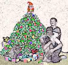 Hobo received gifts from all his family, so many that he couldn't play with them all. He was given hugs and kisses as each gift was placed in front of him. It was so good to be home. He gave licks and kisses back. .(c)Somehow there were even presents from Teddy Bear, and to Teddy Bear from Hobo. Hobo bounced around the room as he watched everyone ripping open the wonderfully covered packages. He barked along with the children's laughter. So this was Christmas, he had finally discovered and experienced the joy of gift giving. And later he was treated to a special Holiday meal. Most of all, Hobo had found out that Christmas was a time of giving and recieving love, and being home with his family. "Hey Mom, where did this Key come from?" someone said.